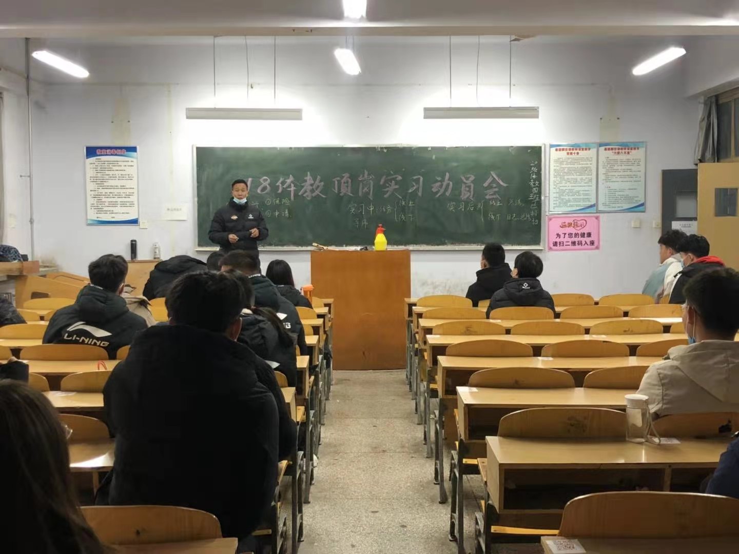 2021年1月11日上午9:00,按防疫要求,尽量减少学生集中,公共教学部利用学生期末理论考试集中机会,对18体教专业学生进行2.5+0.5的顶岗实习前动员。
