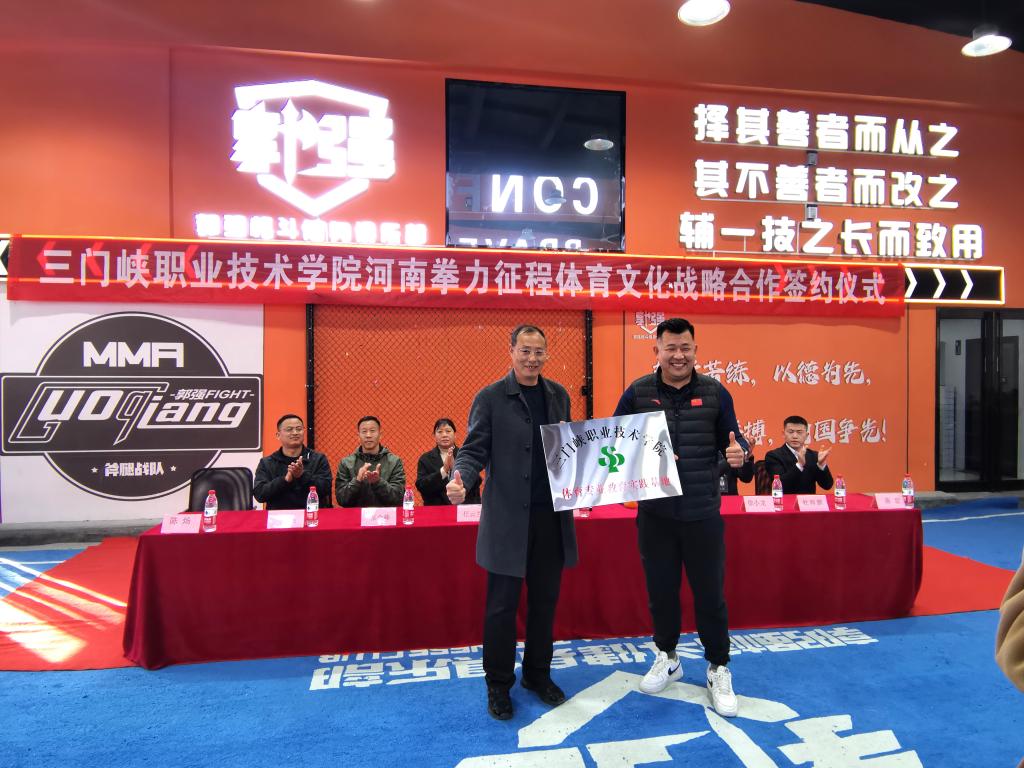 3月20日下午,PA集团官方网站院长曲扬一行赴三门峡郭强格斗健身俱乐部,与河南拳力征程体育文化传播有限公司(三门峡郭强格斗俱乐部)签订战略合作框架协议并举办体育专业教育实践基地授牌仪式。PA集团官方网站教学工作负责人任云兰、实训科负责人、民族传统体育专业负责人,郭强格斗俱乐部董事长郭强、俱乐部各部门负责人出席仪式,仪式由郭强格斗总经理徐云海主持。